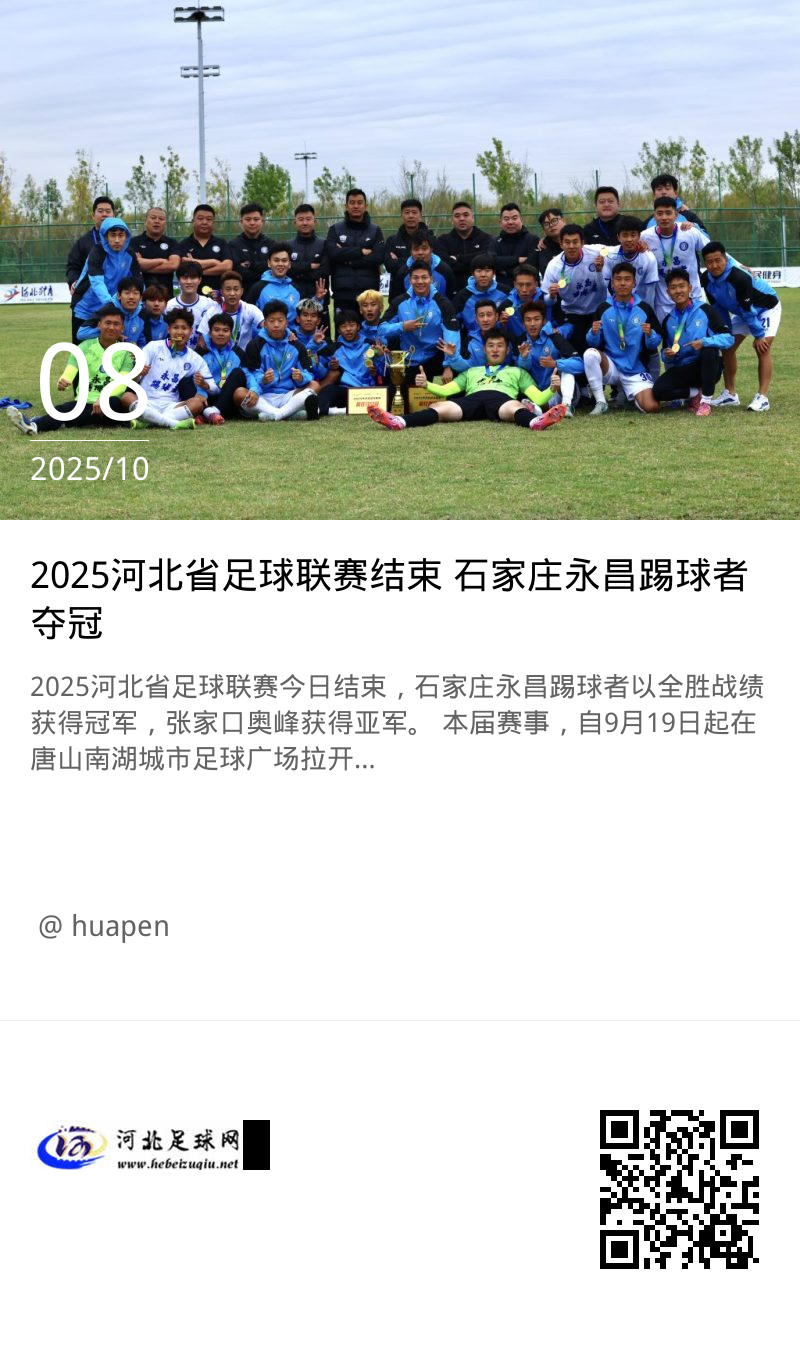 2025河北省足球联赛今日结束,石家庄永昌踢球者以全胜战绩获得冠军,张家口奥峰获得亚军。
