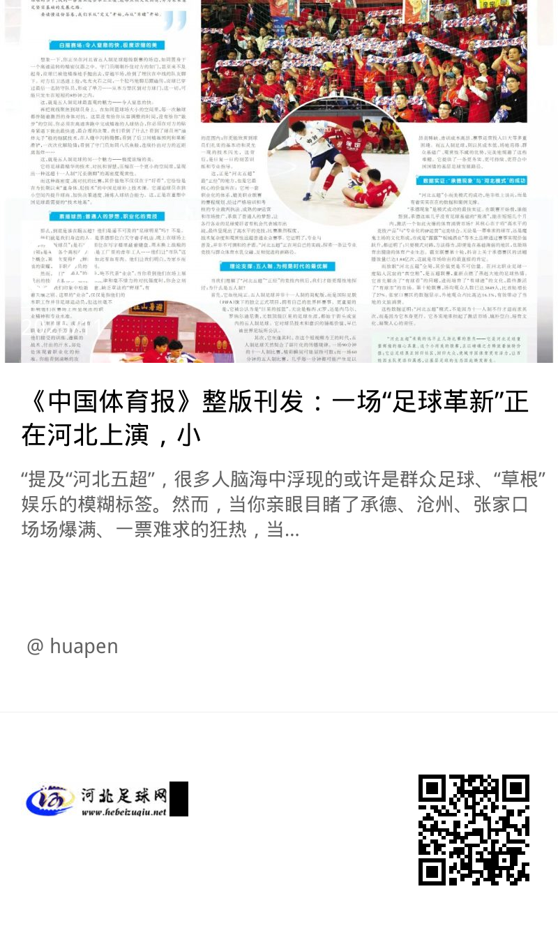 “提及“河北五超”,很多人脑海中浮现的或许是群众足球、“草根”娱乐的模糊标签。然而,当你亲眼目睹了承德、沧州、张家口场场爆满、一票难求的狂热,当你刷到抖音上数千万播放量的精彩集锦,当你听到“火爆五超”正屡屡霸占“热搜”时,一种认知错位感便油然而生。