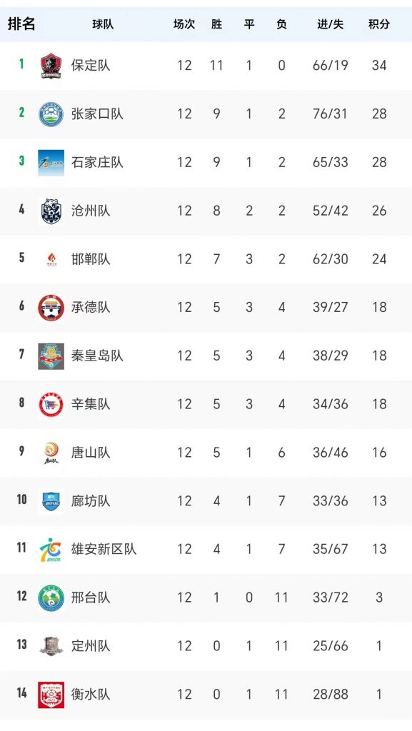 张家口队与石家庄队同积25分,形成激烈的次席之争。张家口队本轮3:2险胜承德队,凭借66粒进球带来的35个净胜球优势,成功反超石家庄队跃居积分榜第二位;石家庄队本轮3:5不敌邯郸队,虽11轮保持8胜1平2负的战绩,但31个净胜球略逊于张家口队,暂列第三位。