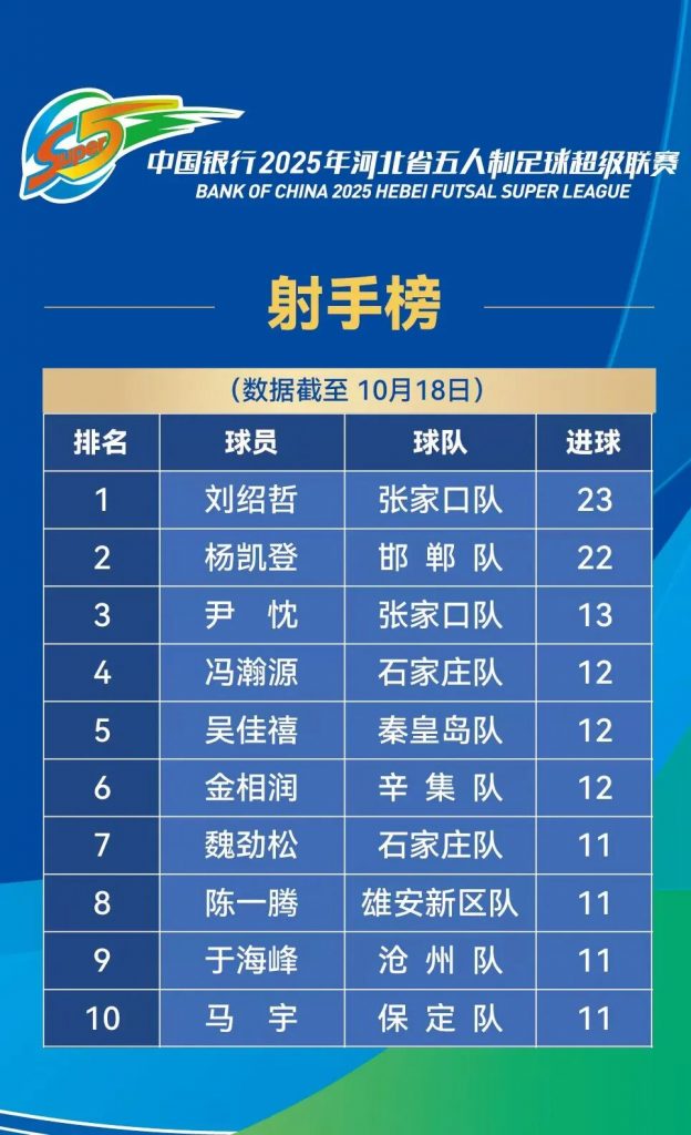 相较于积分榜的稳定,第十轮射手榜迎来关键变动,张家口队的刘绍哲以23球成功逆袭,将榜首位置收入囊中。作为球队的进攻核心,刘绍哲的爆发式表现不仅助力张家口队稳居上游,更印证了河北本土球员在五人制足球领域的强劲实力。