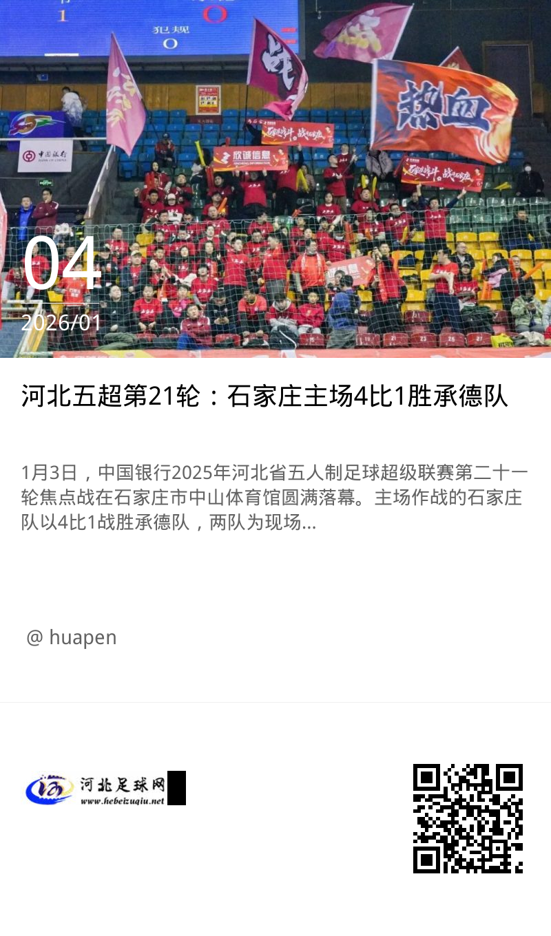1月3日,中国银行2025年河北省五人制足球超级联赛第二十一轮焦点战在石家庄市中山体育馆圆满落幕。主场作战的石家庄队以4比1战胜承德队,两队为现场球迷奉献了一场精彩绝伦的对决。