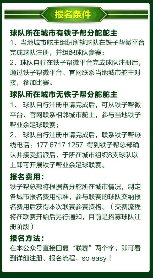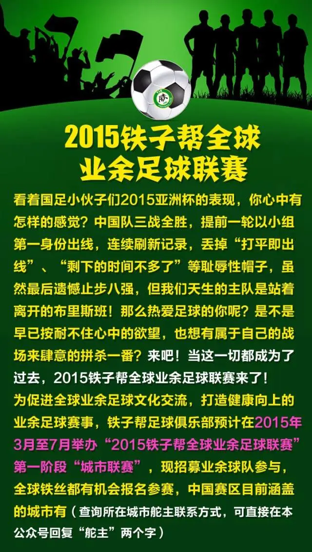 石家庄报名球队,可以联系河北足球微信编辑,或关注河北足球微信,获取更多关于铁子帮全国联赛信息。